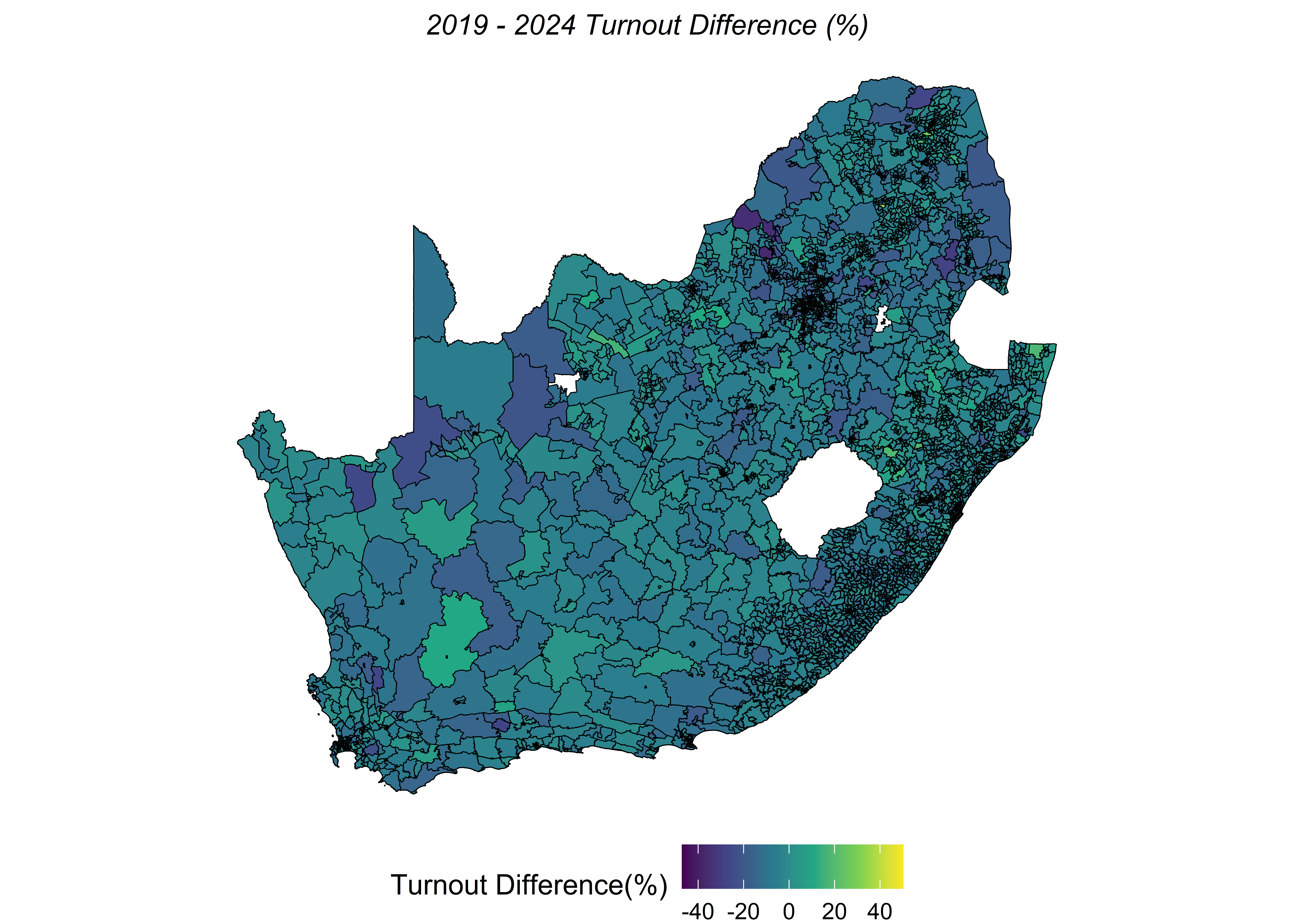 The final dataset contains an sf object with the aggregate turnout results across wards in both the 2019 and the 2024 National and Provincial Elections. Our variable of interest is the turnout change from 2019 - 2024.