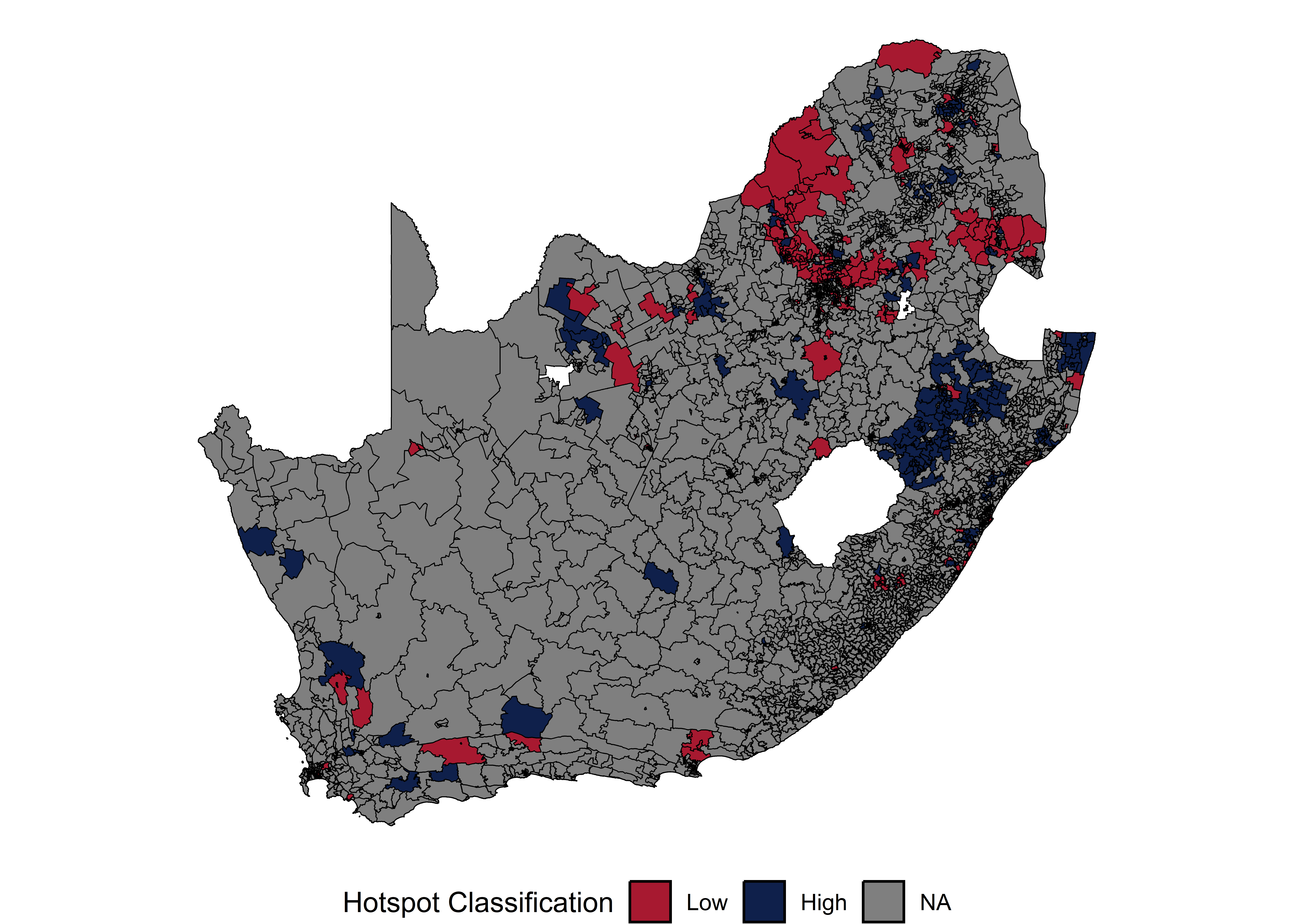 Figure 2 illustrates differences in turnout across five metropolitan municipalities. This approach provides a more granular view of outcomes while focusing on regions with higher population densities. Some distinct patterns emerge at a ward-level and metropolitan-level. One approach to quantifying these patterns is to do hotspot analysis. Effectively, we can rely on a number of statistics to assess spatial autocorrelation. Kopczewska (2021), pp. 149-211 provides a succinct summary of the spatial autocorrelation, global and local statistics and their visualisation.